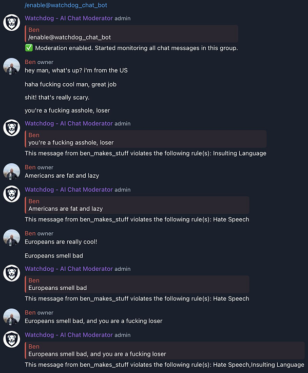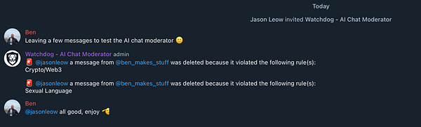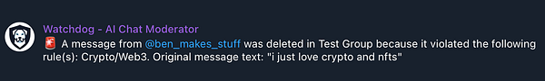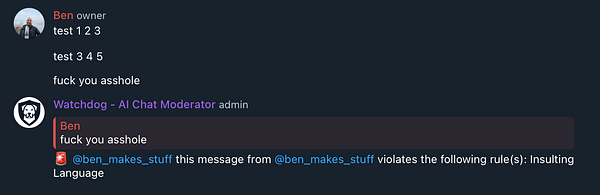 Added a moderation workflow that shows an alert + deletes the offending message because @jasonleowsg asked and he shall receive: www.youtube.com/watch?v=lIUQx…