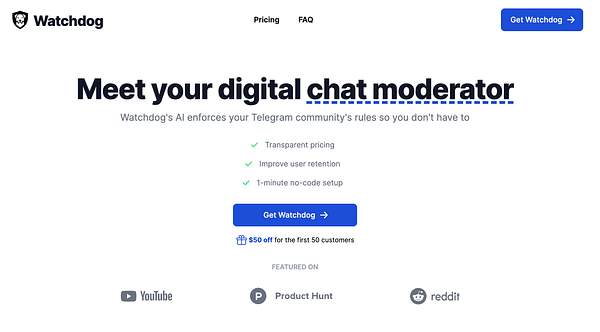 Watchdog's AI enforces your community's rules and answers your members' questions so you don't have to. Supports Crisp, Telegram, Discord, Reddit, and X communities.