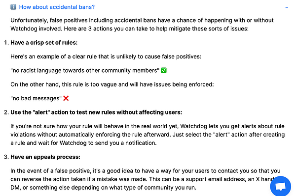 Added a detailed FAQ answer to watchdog.chat about the possibility of false positives. Thanks to @CrusherCake for the feedback
