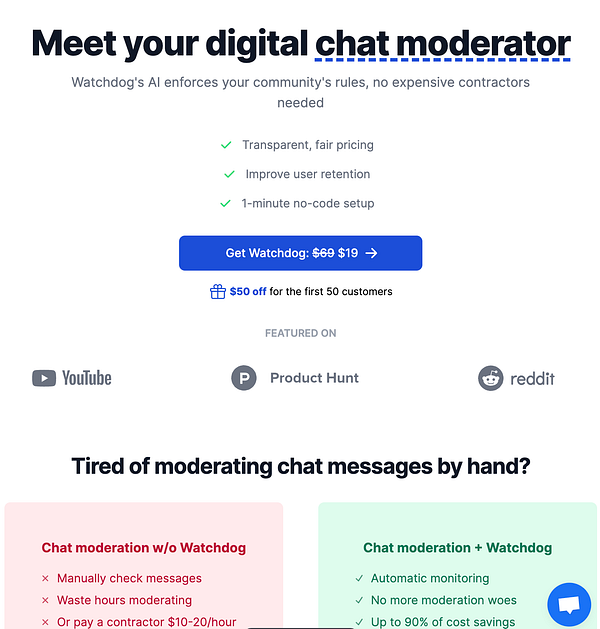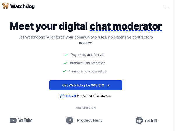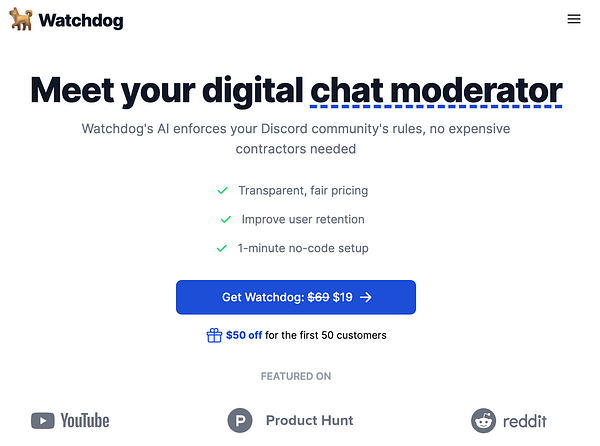 Watchdog's AI enforces your community's rules and answers your members' questions so you don't have to. Supports Crisp, Telegram, Discord, Reddit, and X communities.