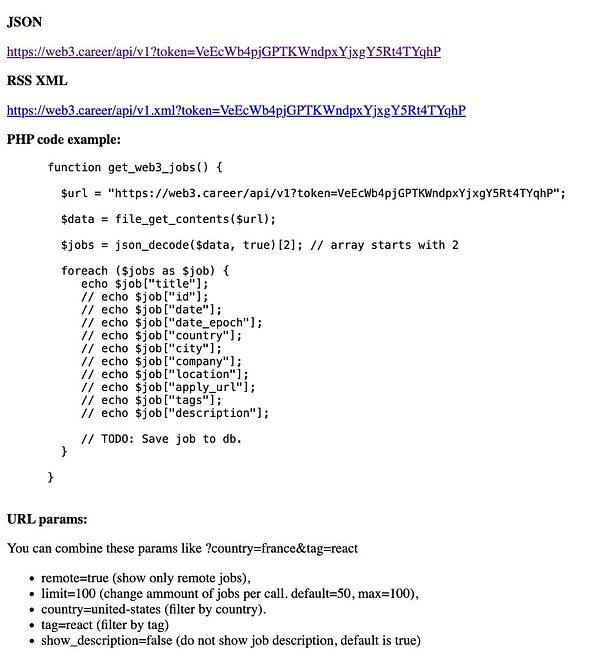 Add PHP code example to email for Web3 Jobs API new users, so they can just copy it and start using it instantly. That’s how I imagine API docs should be, no bs.