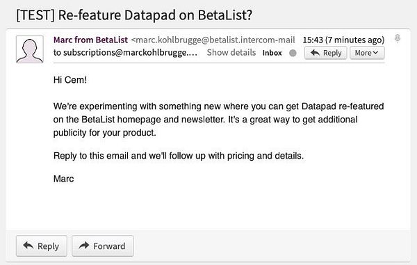 Make "Advertise on BetaList" follow up email to featured startups more direct (versus "how's it going bla bla ps you can advertise" which we had before)