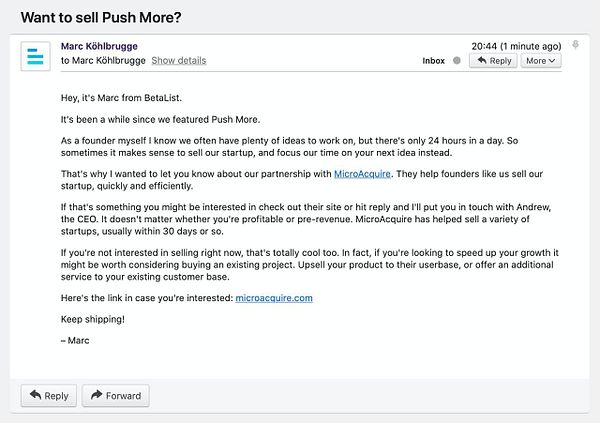 Write follow-up email for featured startups about MicroAcquire partnership #betalist
