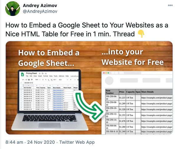 #sheet2site tweet about how to embed google sheet for free twitter.com/AndreyAzimov/stat…