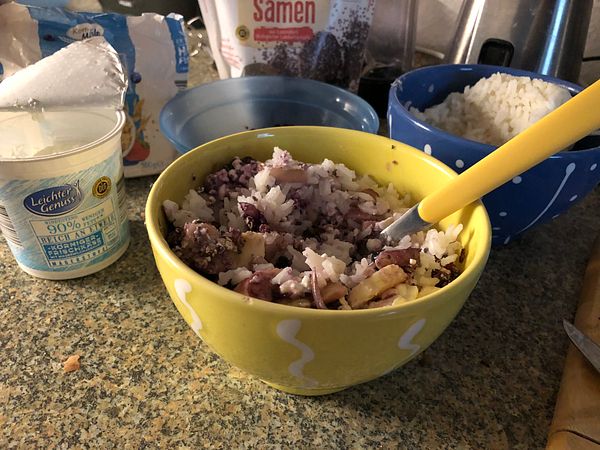 seared and all that mixed together. On top of that apple-pear pulp (with no added sugar) but not shown in the photo