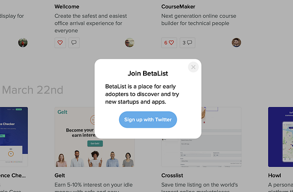 Show modal when trying to sign up/in, instead of directly redirectign to Twitter. In preparation for adding regular email-only registration