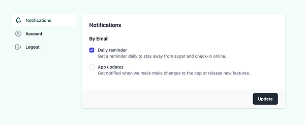 Added notifcation settings for daily remider and app updates #nosugartoday