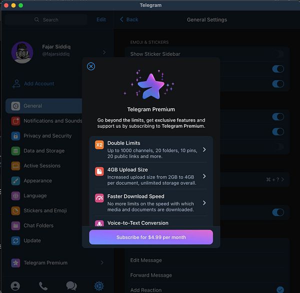 Settings > General > Telegram Premium is now available #fajarsiddiq