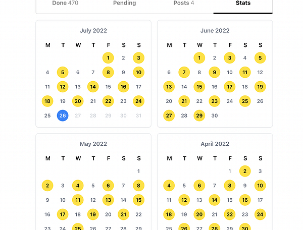 Add calendar view to product stats so you can quickly see how often you ship for a product, work out, have a social drink, or whatever else you want to track