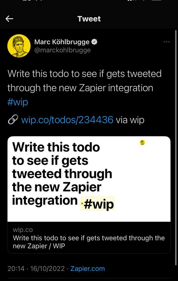 Write this todo to see if gets tweeted through the new Zapier integration #wip