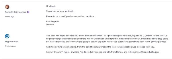 tell heroku than I'm never using their product again π because they changed the pricing of the mini db from 0.1/month to 5/month without letting me know