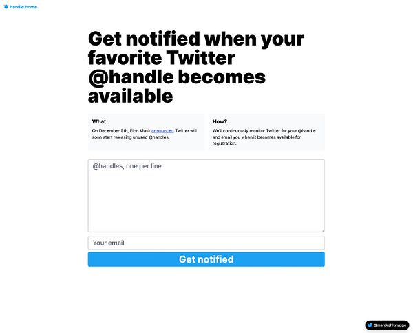 Make quick handle.horse site that notifies you when a Twitter handle becomes available
