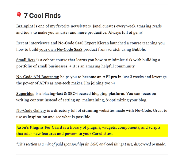 First ad to go out on Katt's No Code Exits newsletter - nocodeexits.substack.com/p/to… #pluginsforcarrd