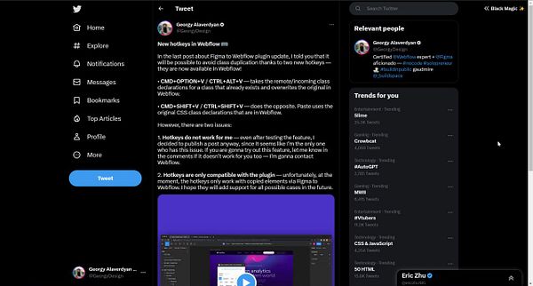 Tweet about new Webflow hotkeys #georgydesign #firststreaks