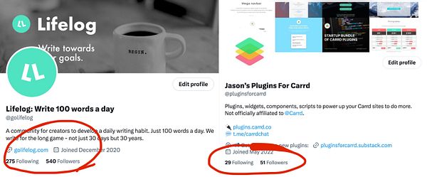Culled my follows:followers ratio on @golifelog and @pluginsforcarrd Twitter accounts to a ratio of less than 0.6, to not hamstring the accounts algo-wise