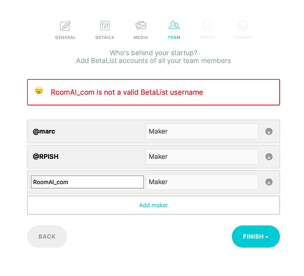 Remove support for Twitter handles and only support BetaList usernames when adding a maker to your startup #betalist