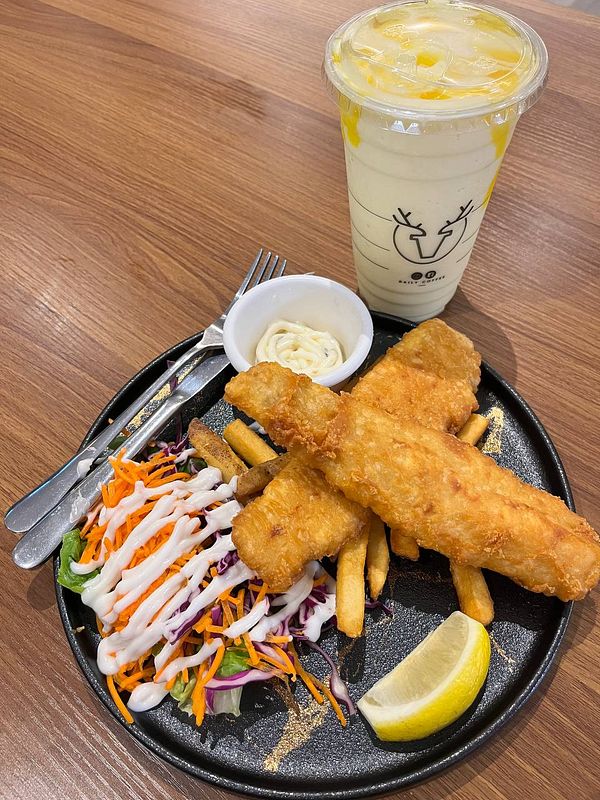 eat fish & chips with ice blended mango drink #fajarsiddiq