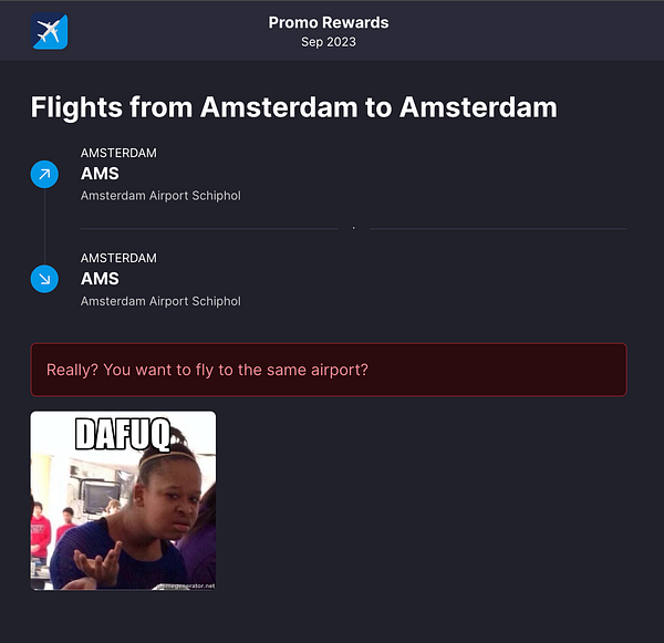 create alert when route iatas are same #rewardsflights