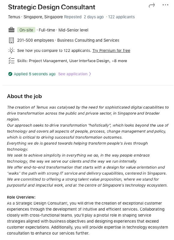 Applied for Strategic Design Consultant, Temus Singapore, via LinkedIn -