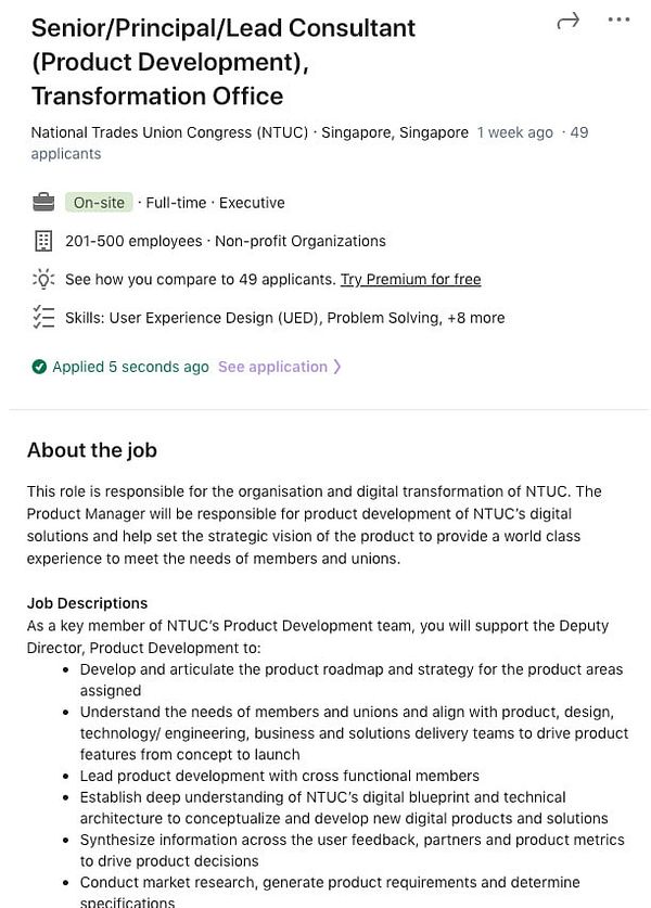 Applied for Senior/Principal/Lead Consultant (Product Development), Transformation Office, NTUC -