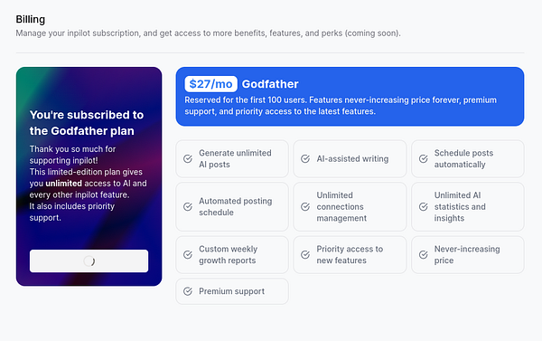 Billing section improvements, show custom card w subscription management if subscribed #inpilot
