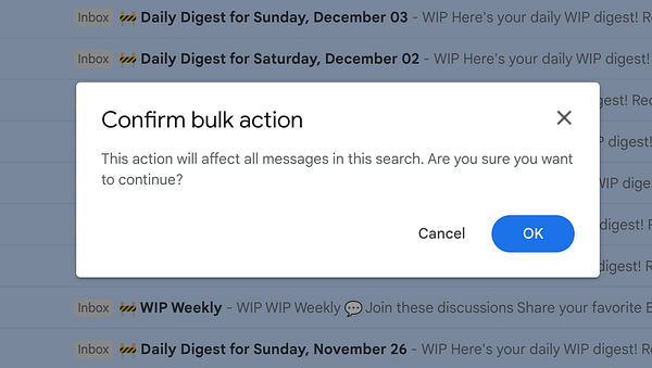 Delete 233 WIP's daily digest emails #rebuildinpublic