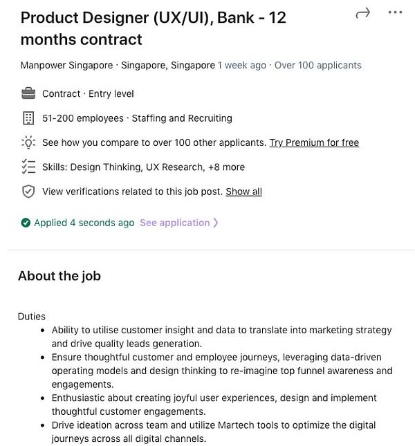 Applied for Product Designer (UX/UI), Bank - 12 months contract for a bank via recruiter Manpower Singapore -
