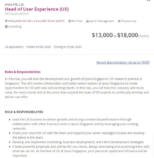 Applied for Head of User Experience (UX) for IPSOS PTE. LTD. - www.mycareersfuture.gov.sg/jo… #outsprint