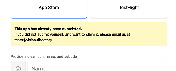 When trying to submit an app that's already in our database, don't show a vague validation error message but explain what's happening #visiondirectory
