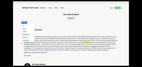 set up alerts page with sort and filter functionality for newsletterscan #sponsorgap