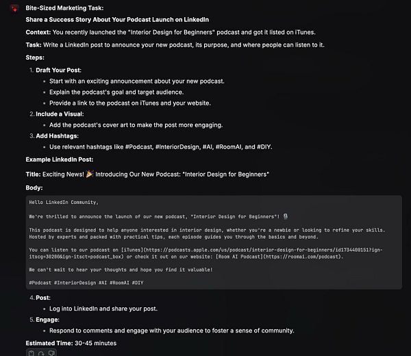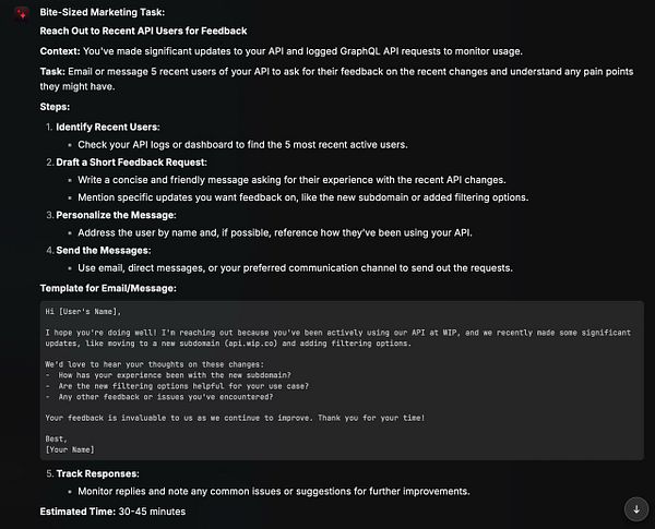 Make prototype for AI-powered marketing coach that suggests bite-sized marketing tasks based on your WIP history #wip