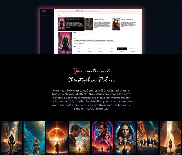 Improved homepage with posters and app screen melies.co #melies
