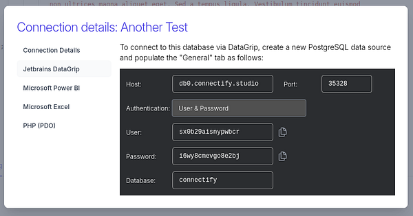 Added a Jetbrains DataGrip-specific window for connection details #connectify
