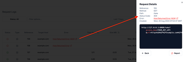 Rendering HTTP status code in the #screenshotone dashboard when the target website returns an error.