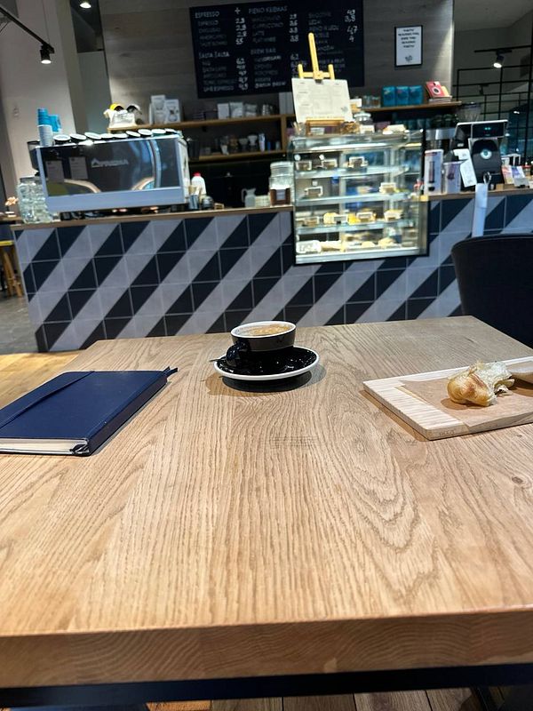 morning coffee, croissant and journaling