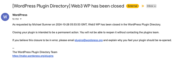 close Web3 WP plugin - no longer using the name #life