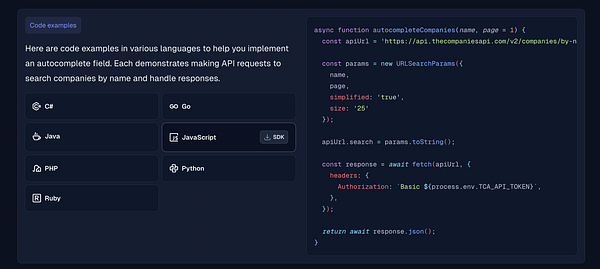 Add block in use cases with code language switcher #thecompaniesapi