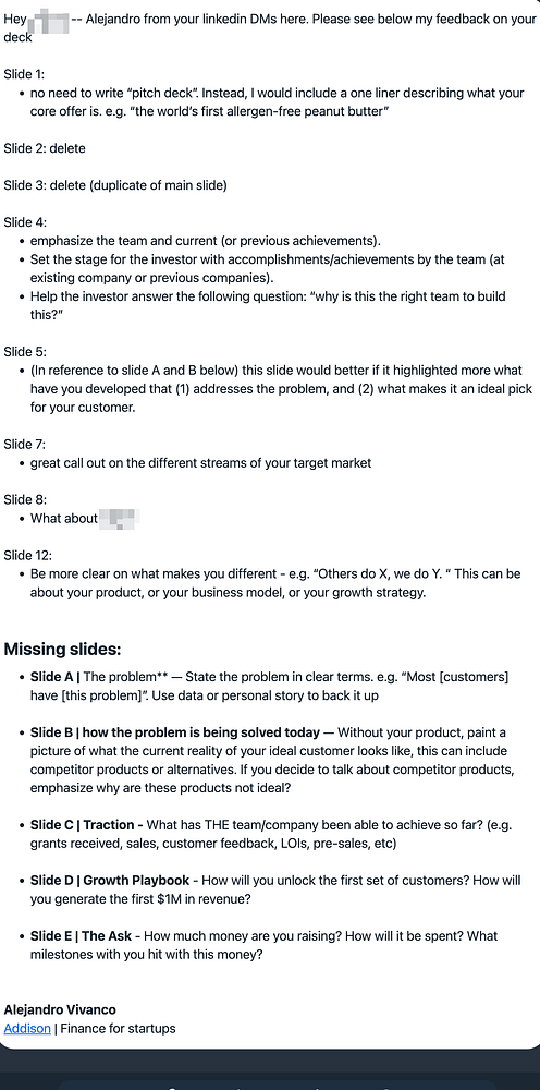 send LinkedIn inbound message feedback on their pitch deck #addison