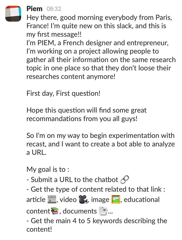 Setup the my Recast profile and post a message on the Slack community #pickant