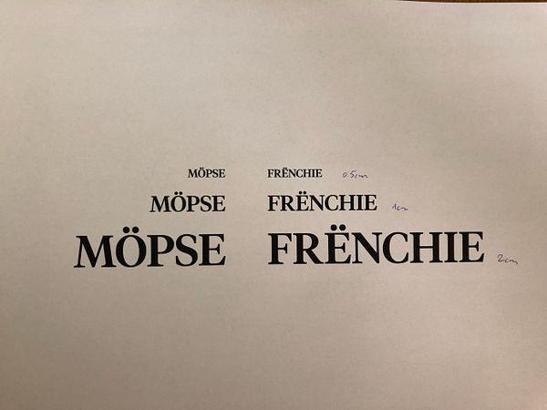 print #mopseandfrenchie wordmark and test sizes from 1 to 3 cm